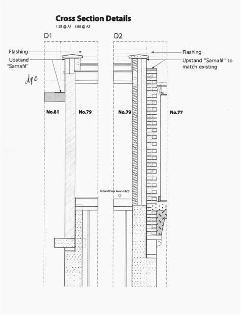 - That the raised parapet shown on detail D1 should be formed as an extension to the existing solid 9 inch brick wall and not in cavity construction.